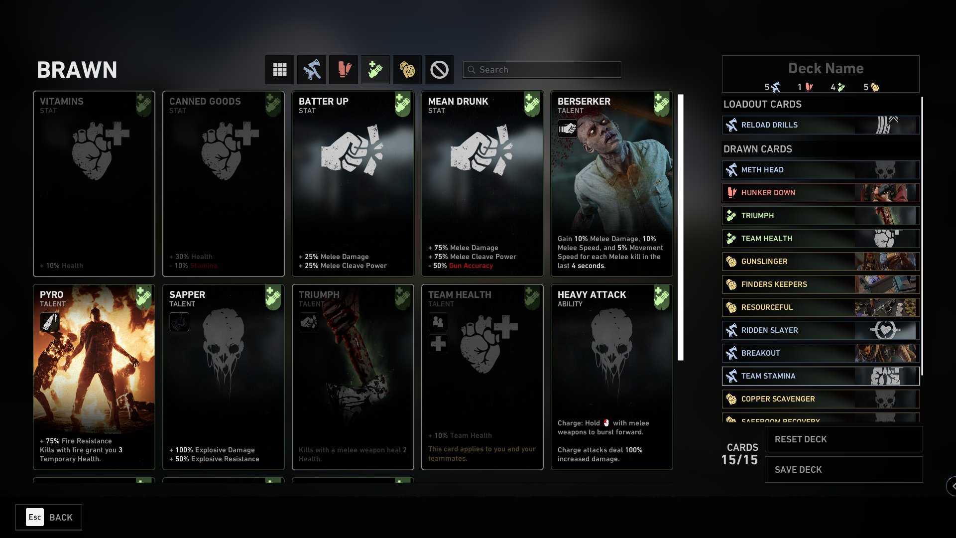 کارت‌های ابتدایی ممکن است کمی خسته‌کننده به نظر برسند (مثلا یکی از اولین کارت‌ها، فقط ۱۰+ استقامت اضافه می‌کند.)، اما به زودی مهارت‌های تحول‌آفرینی باز می‌شوند که بازیکنان را تشویق به شخصی‌سازی بیشتر دسته کارت‌ها بر اساس شیوه بازی مخصوص هر بازیکن می‌کند. بعد از شاید ۲۰ ساعت بازی، بازیکنان می‌توانند یک دسته کارت فوق‌العاده و حقیقتا اثرگذاار بسازند که با کلاس و شخصیت موردعلاقه‌شان به خوبی هماهنگ می‌شود. تا زمانی که همه کارت‌ها کشیده شوند، بازیکنان می‌توانند کیت‌های پزشکی بیشتری حمل کنند، هم‌تیمی‌ها را بهتر از خودشان درمان کنند و در حالی که دیگران را احیا می‌کنند، مقدار زیادی آسیب دریافت کنند. یکی دیگر از کارت‌های جذاب دیگر، Buckshot Bruiser است که برای هر گلوله تفنگ ساچمه‌ای که به دشمن برخورد می‌کند، HP موقت اعطا می‌کند و در مقابل زامبی‌های مقاوم بازی Back 4 Blood بسیار سودآور است.